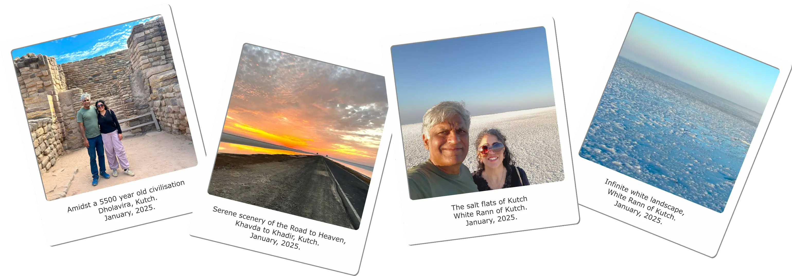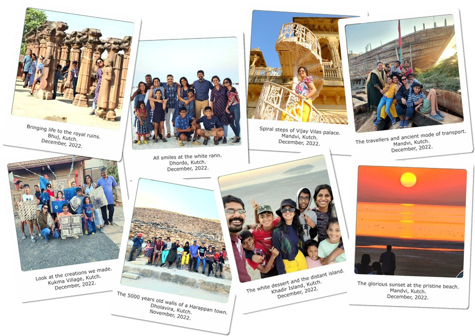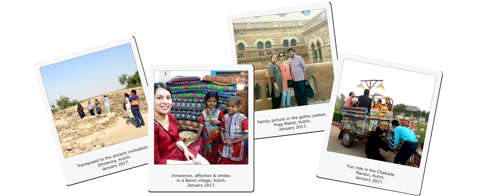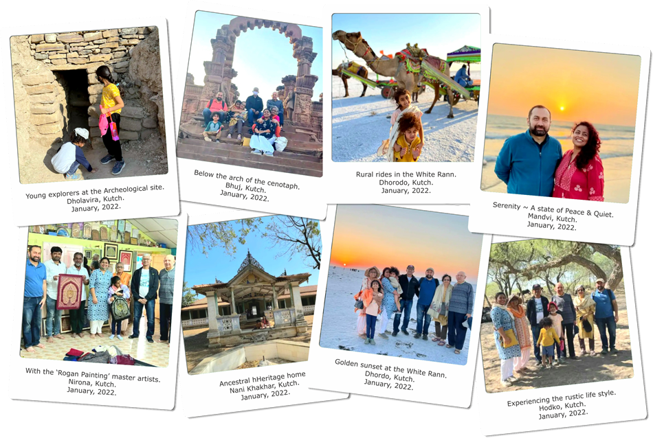 Being native of Kutch, we never knew the beauty lying beyond, and realized that we couldn't have learnt so much and experienced the diversity of Kutchh without Rashmi in this trip. In our childhood days we have read about the Indus valley civilization, and walking through this excavated site along with Rashmi and learning the intelligence behind its built, brought the visuals and divine architecture excellence of that ruling era in front of us. There seemed a lot more to it deep under the ground and we hope someday we will see this civilization completely restored. Furthermore exploring the Rann of Kutch, its heritage, culture, various forms of arts and crafts was enriching. We saw the real beauty of the Rann of Kutchh as we moved from east to north through the Majestic White Rann, the picturesque 'Royal Cenotaphs and Palaces', temples and its mythology, Village Stay, meeting the locals and learning the various arts first hand. Each artist seemed even more special, after learning the fact that the art was being followed through several generations. One can only say 'Wow'!! Much thanks to you for organizing this personalized, comfortable and memorable trip for us. We look forward to another tour down the lane.