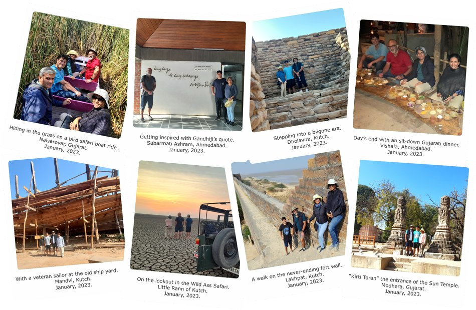We are just back after spending 11 days with Rashmi on a tour of Ahmedabad and Kutch. And what a trip it was. Every single day was different, and each day was meticulously planned, with something different. Whether it was the history of Dholavira and Rani-ki-Vav to the beauty of the Calico museum, from the wonder of the Lakhpat Fort to the fading craft of dhow-making at Mandvi, from visiting the artists in village Nirona and weavers in Bhujodi to spending a night in a village school near Dholavira, we experienced it all, thanks to Rashmi.