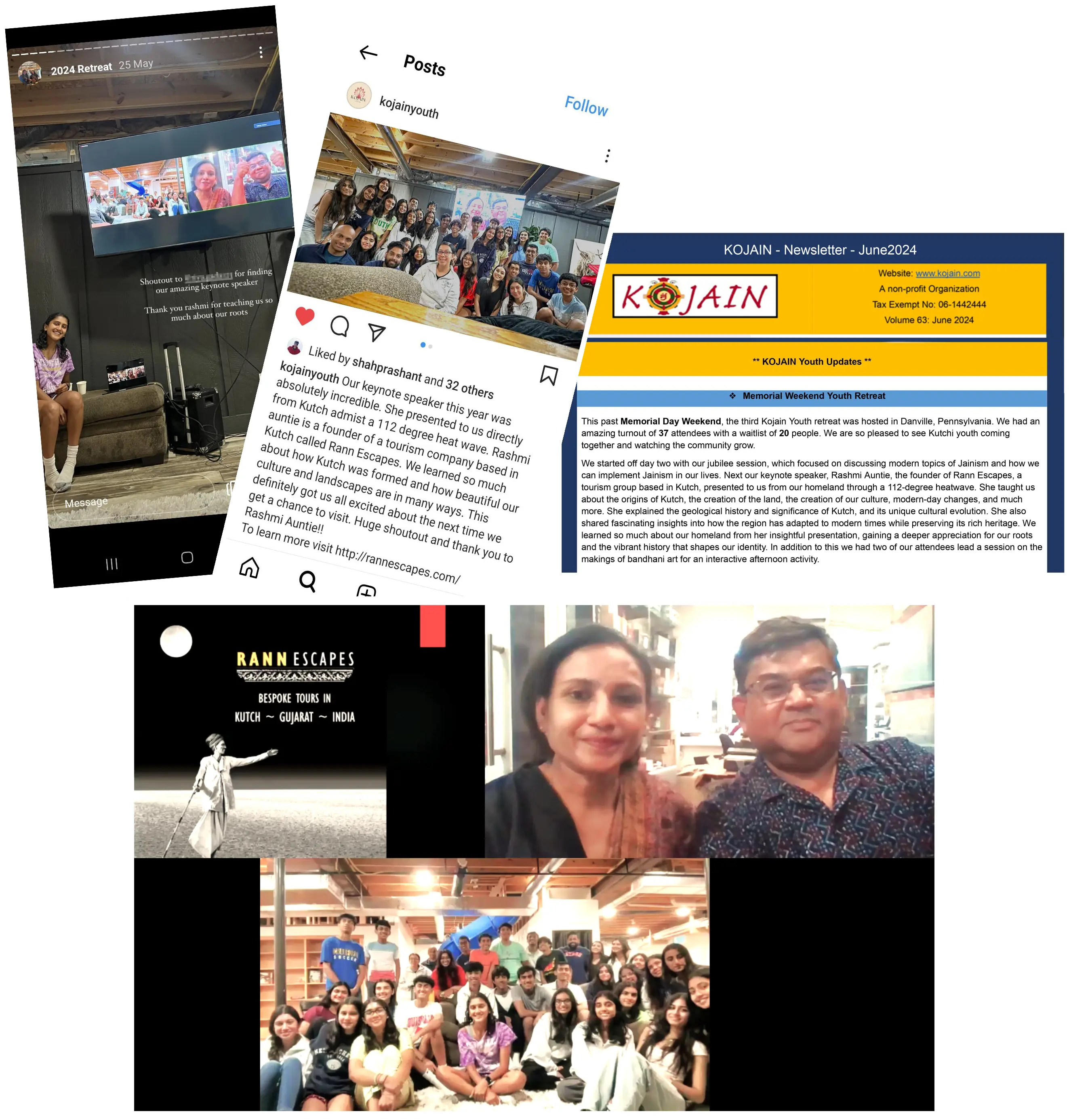 KOJAIN YOUTH the youth wing of KOJAIN, a non-profit association of the Indian Jain community settled in the USA, invited Rashmi as an Keynote speaker for their annual retreat. The 1-hour online talk (over Zoom meet) titled "Migration Nation - Kutch" touched upon an exhaustive list of various facets of Kutch. The presentation gave this 2nd generation of the Indian Jain diaspora a wider perspective of their native motherland and brought them closer to their roots.